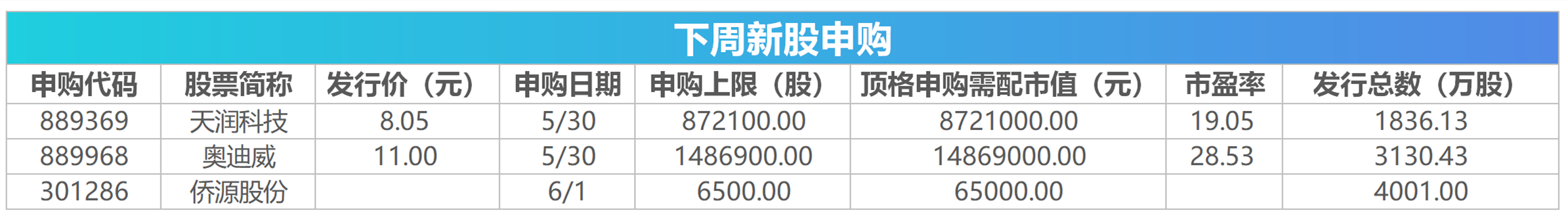 Wind数据统计显示,下周(5月30日至6月2日)将有3只新股发行,其中创业板有1只。5月30日发行的是奥迪威、天润科技;6月1日发行的是侨源股份。这3只新股累计发行数量共计约0.97亿股,预计募集资金金额共计15.74亿元。