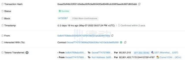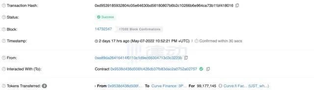 约10分钟后,一个新地址突然抛售了价值8400万美元的UST,瞬间影响了3crv池原本的平衡。