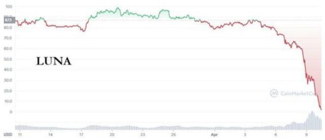 两天暴跌之后不仅UST和美元严重脱钩,“币圈茅台”Luna市值仅剩11亿美元(4月5日曾达到119.5亿美元的近日高点,历史最高市值曾为410亿美元),比特币也直接创下近两年新低。