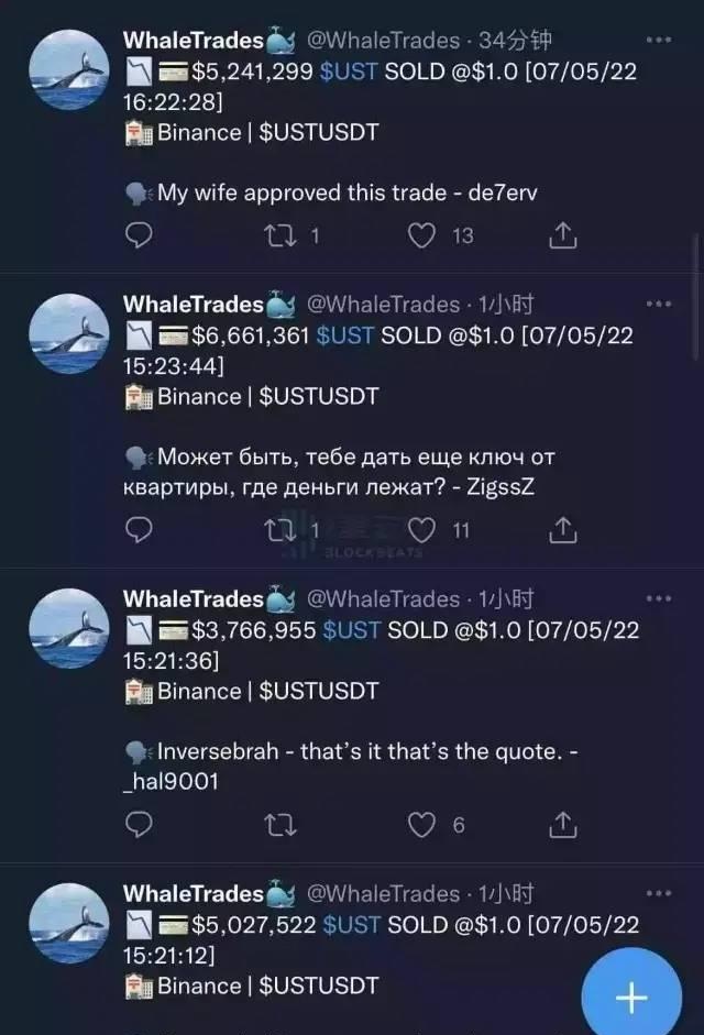 没过多久,多个巨鲸帐户开始不断在币安(Binance)上抛售UST,每笔交易金额都是百万美元级别。