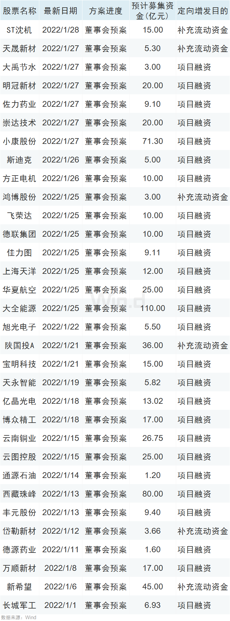 据Wind数据统计,截止1月28日,本月A股两市涉及补流、项目融资的公司共有132家,共约募资2700亿元。最新公布董事会预案相关公司如下: