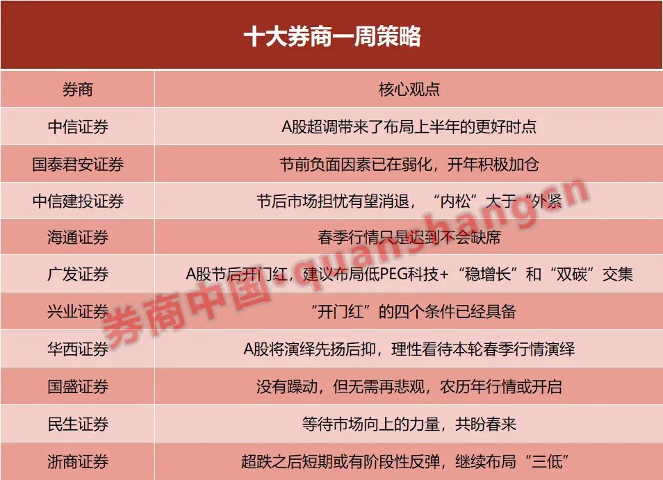 中信证券认为,1月高位抱团瓦解引发了资金连锁反应,节前市场流动性压力顶点已现;信用拐点尚需时间验证,年报预告不乏亮点,当前是基本面预期的底;春节长假效应叠加海外风险担忧,节前出现了风险集中过度释放,情绪底也已经出现。政策底早已明确,“情绪底”和“市场底”共振下,A股的超调带来了布局上半年的更好时点,建议围绕两个低位积极布局迎接行情起点。具体包括:1)基本面预期处于相对低位的品种,重点关注前期受成本问题压制的中游制造,如汽车、光伏风电设备等,基本面预期仍处于低位的航空和酒店;2)估值仍处于相对低位的品种,建议关注地产信用风险预期缓释后的优质开发商、建材和家居企业,经历中概股冲击后的港股互联网龙头,以及具备新材料等新业务发力能力的精细化工企业。