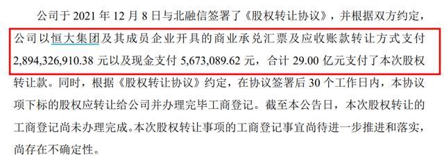 但是,兆驰表示,又准备花29亿元购买昆明丰泰 44.6154%的股权,用的是以恒大集团及其成员企业开具的商业承兑汇票及应收账款转让方式支付28.94亿元(2,894,326,910.38元)以及现金支付5,673,089.62元。