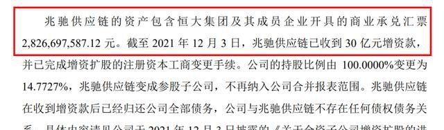 于是,兆驰为最大限度降低恒大集团及其成员企业债务违约带来的风险,就通过增资的方式,将上面“踩雷"28.27亿元恒大的兆驰供应链剥离出去。