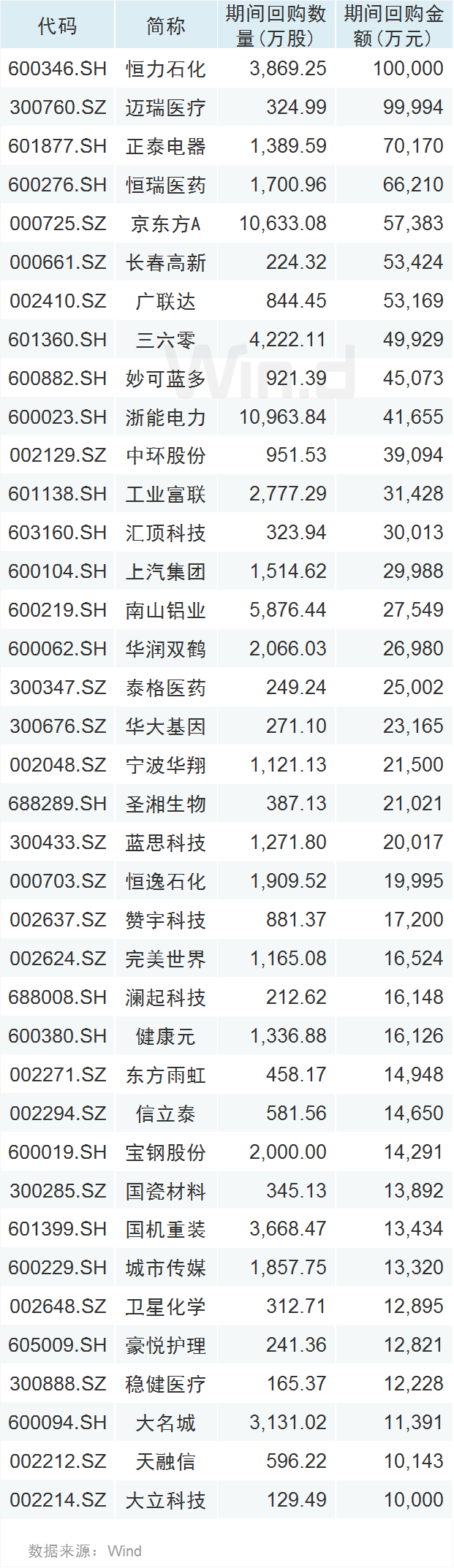其中,恒力石化、迈瑞医疗、正泰电器、恒瑞医药、京东方A、长春高新、广联达、三六零、妙可蓝多、浙能电力等公司回购金额超4亿元