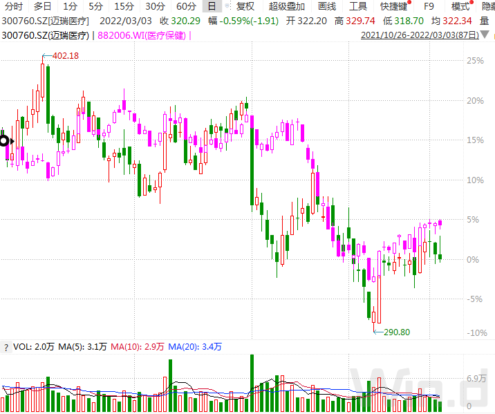 回购金额排名第二的迈瑞医疗,在2月10日和23日合计回购约10亿元,但公司股价走势基本与医疗板块保持一致。