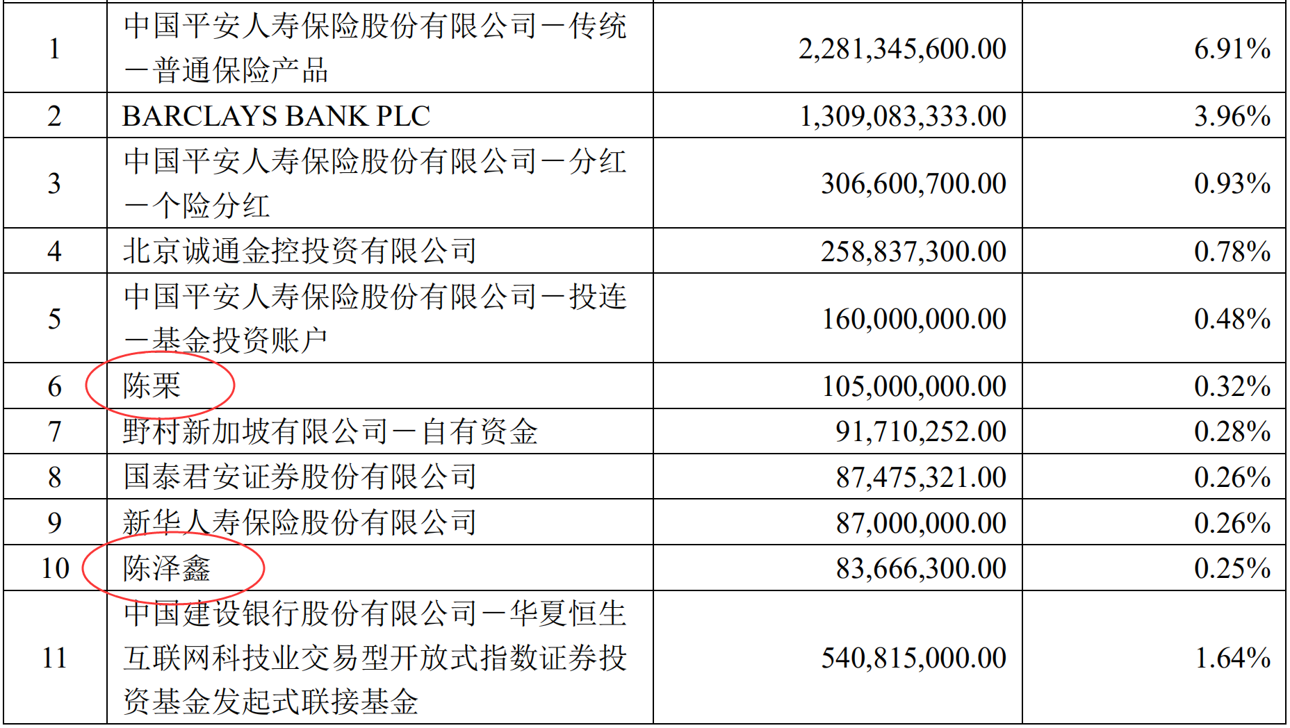 恒生互联网ETF前十大持有人中包括保险、券商、外资、牛散等。其中,两名自然人陈栗、陈泽鑫分别持有1.05亿份、8366.63万份,分别占恒生互联网ETF上市总份额的0.32%、0.25%,位列第六大、第十大持有人。