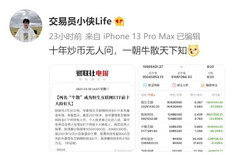 3月30日午间,一个微博ID名为“交易员小侠Life”的用户截取了牛散成为恒生互联网ETF前十大持有人的新闻以及标注着“陈泽鑫”证券账户的两张截图,并配以“十年炒币无人问,一朝牛散天下知”的文字。截图显示,陈泽鑫持有恒生互联网ETF9063.06万份,持仓总市值为3326.14万元,持仓浮亏1954.74万元,亏损幅度为37.05%。