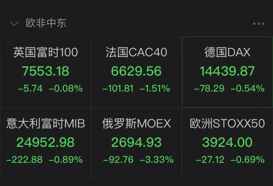 欧洲股市全线下跌,截至发稿,英国富时100指数跌0.08%,法国CAC40指数跌1.51%,德国DAX指数跌0.54%。