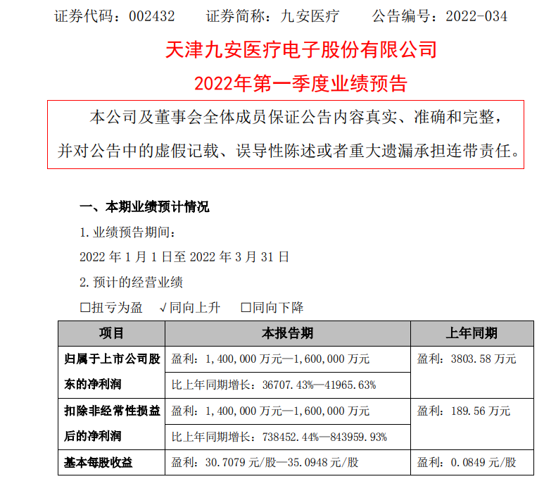 4月12日早间,九安医疗在深交所发布业绩预告,预计一季度净利润为140亿元至160亿元,同比增长36707.43%至41965.63%。扣非净利润140亿元至160亿元,比上年同期增长738452.44%至843959.93%。